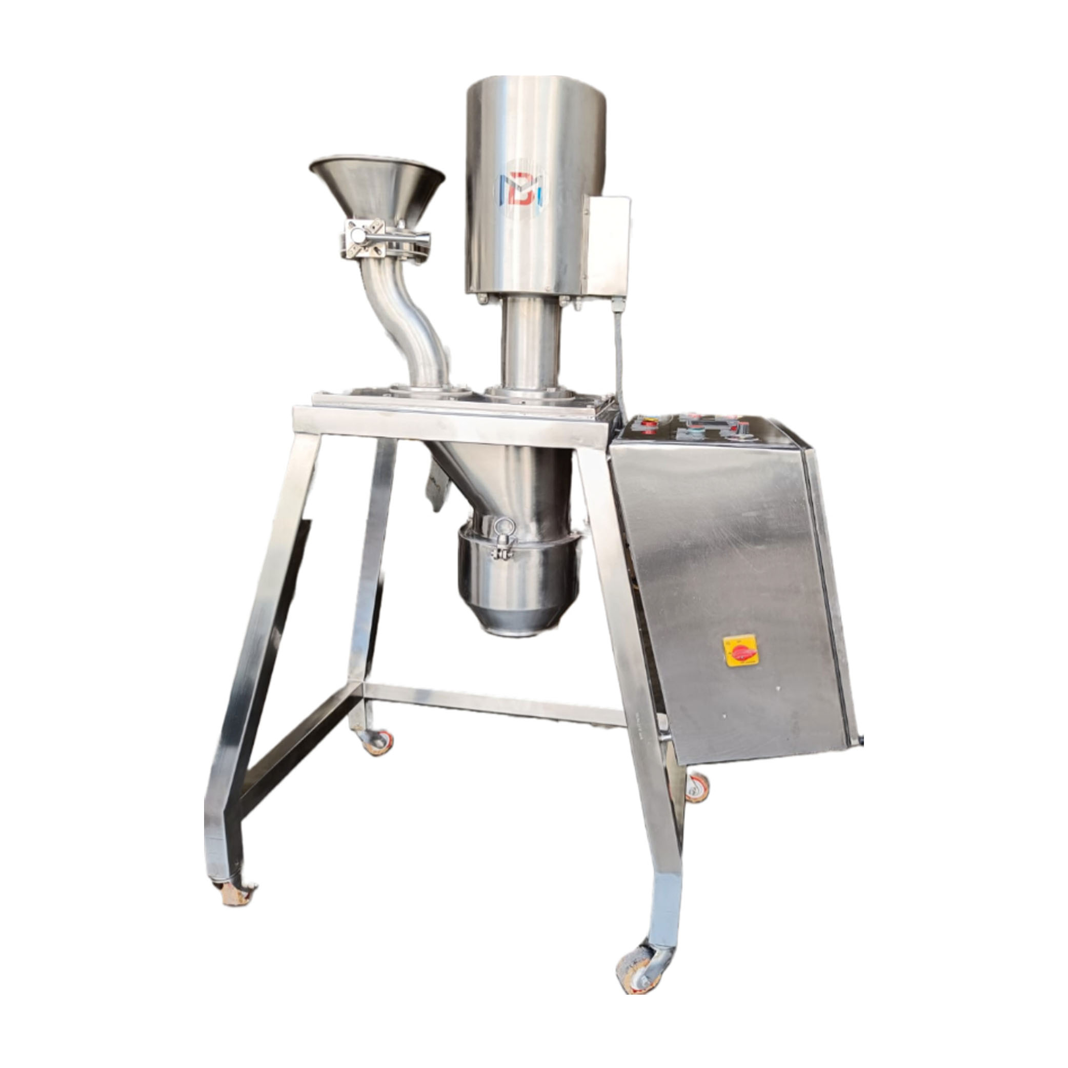 A Co-Mill, also known as a Conical Mill, The Co-Mill operates on the principle of size reduction and particle disintegration through the combined action of impellers and screen. It consists of a conical-shaped rotor or impeller that rotates inside a conical screen. The material to be processed is fed into the centre of the Co-Mill through a hopper.