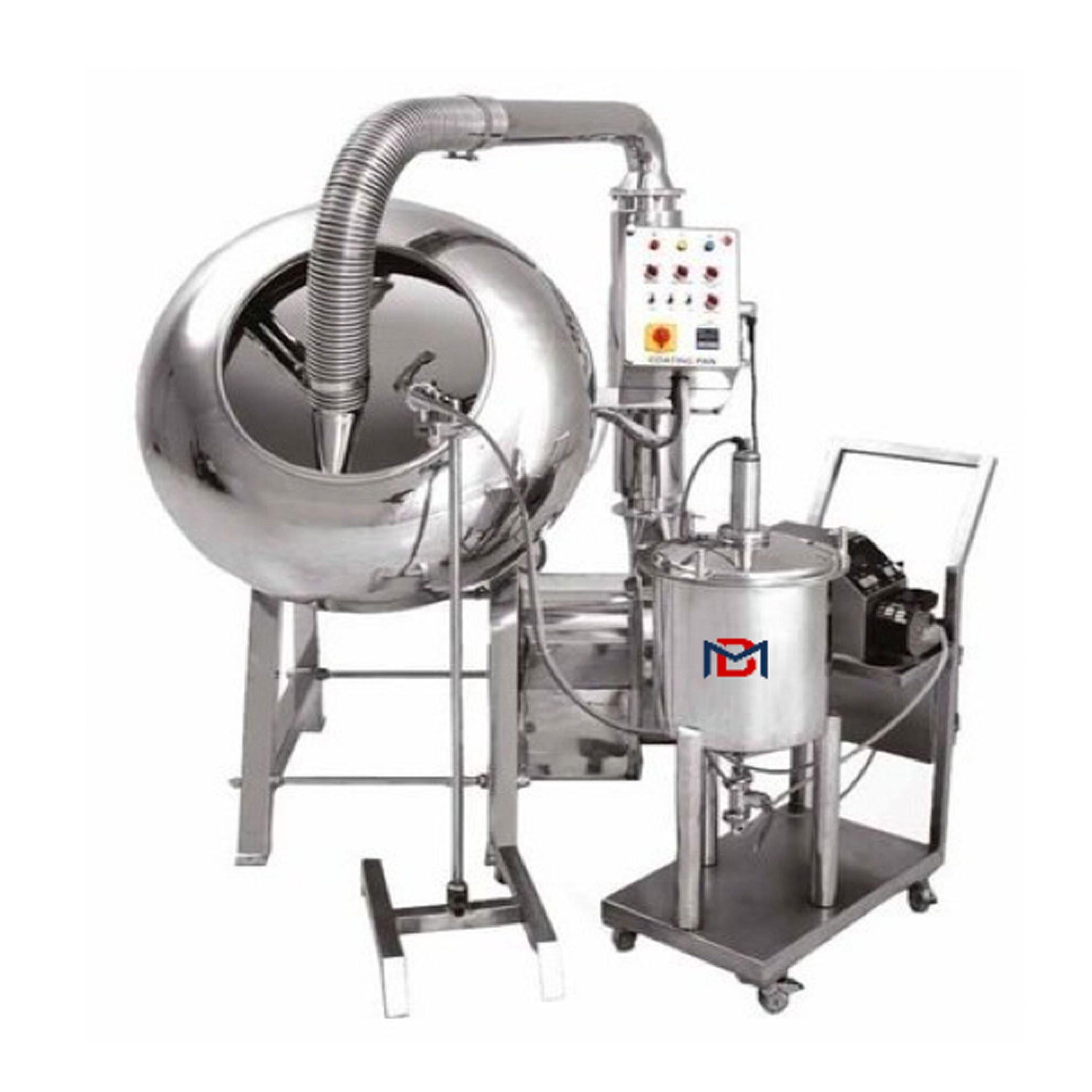 The product is to be filled inside the pan. During the rotation motion, coating material is sprayed by spraying system according to the technological process and rational technological process. So process materials (product) are coated due to rotating pan. The coating round pot is rotated by variable speed. At the same time hot air is supplied through inbuilt Hot air blower system which dries rapidly (heating or cooling) and evenly thus forming a solid and smooth surface.